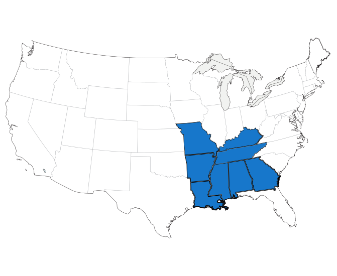 We cover the entire states of Tennessee, Mississippi, Arkansas, Louisiana, plus North Alabama, North Georgia, Southern Missouri, Northeast Texas, Southern Illinois, and Central Kentucky